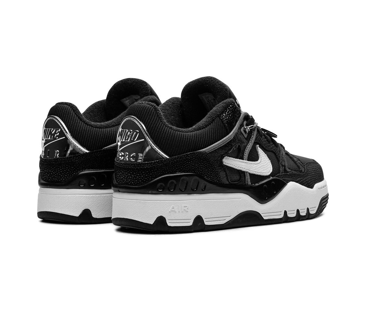 The Nike Air Force 3 Low SP Nigo Black White features a sleek black upper with a crocodile-effect texture. This exclusive collaboration combines the iconic Air Force 3 silhouette with a unique design by artist NIGO, founder of Human Made, to create a stylish piece for discerning sneakerheads.