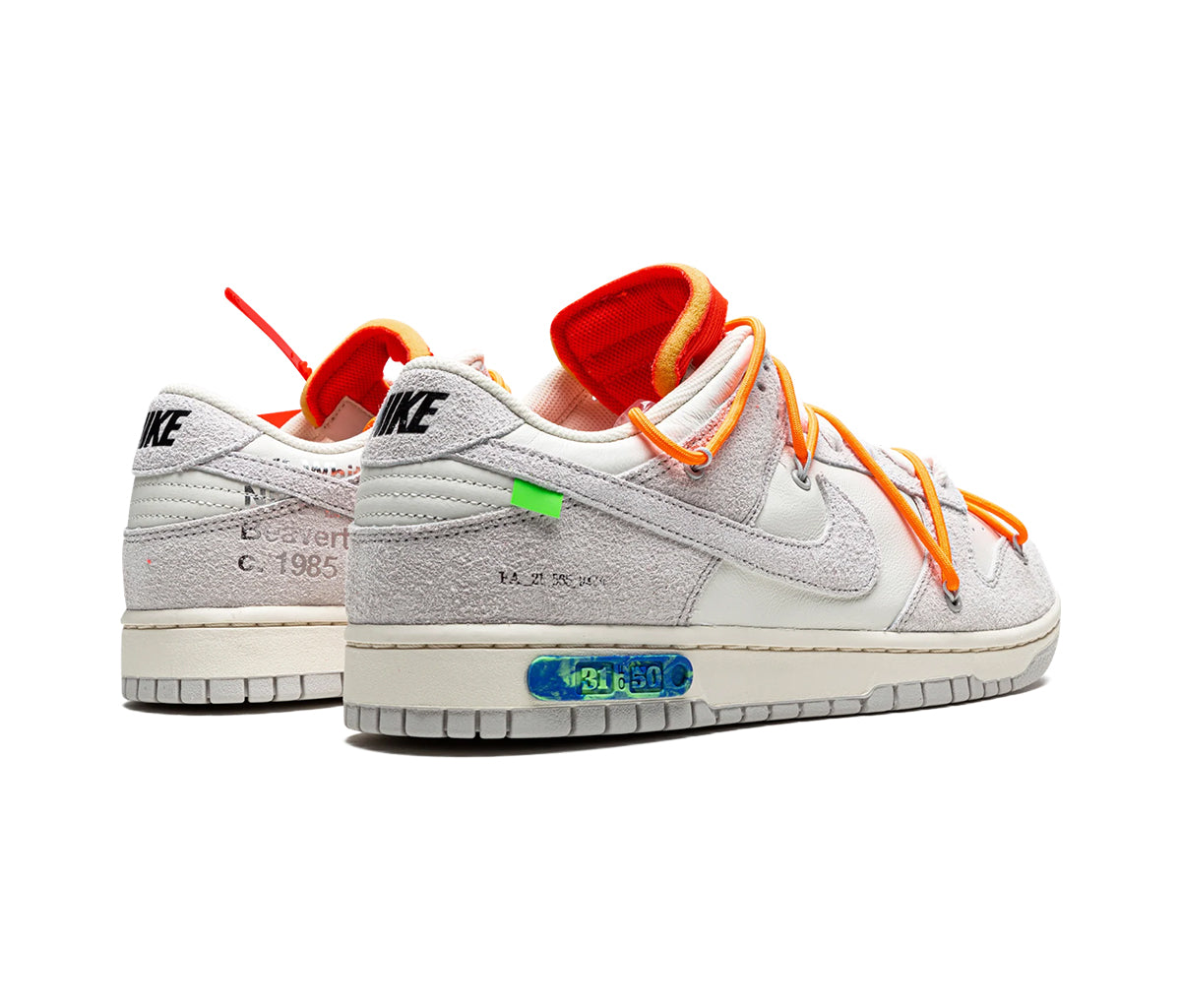 Nízké tenisky Nike Dunk Low Off-White Lot 31 vznikly ve spolupráci se značkou Off-White, která v dané době byla pod vedením dnes již zesnulého umělce jménem Virgil Abloh. V rámci této konkrétní kolekce vyšlo celkem 50 různých párů dunků, kdy každý se liší drobnou barevnou obměnou, použitým materiálem nebo jinou podrážkou.