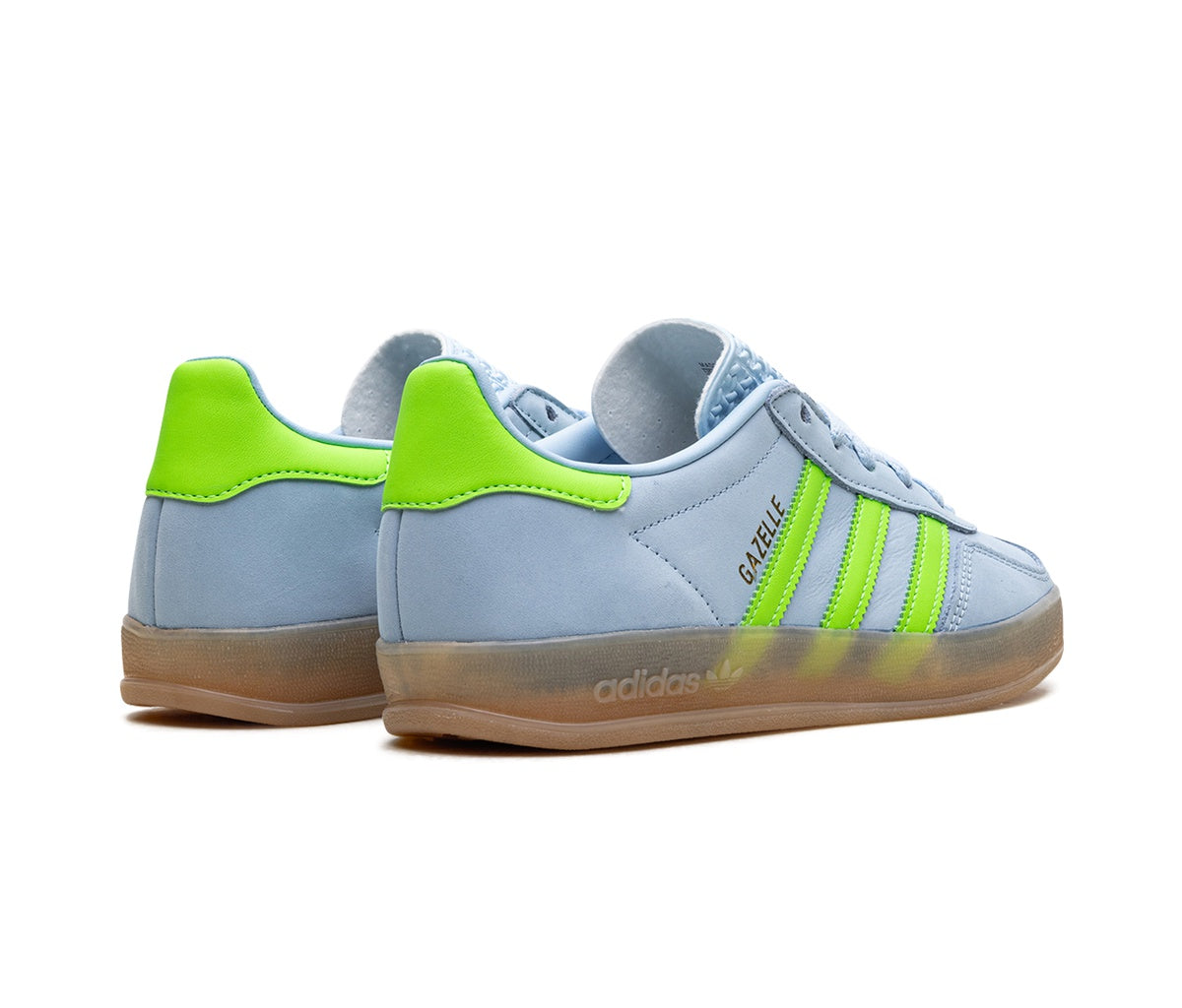 The adidas Gazelle Indoor Clear Sky Solar Green (W) women's sneakers combine a fresh blue and vibrant green colorway on their upper. The classic Gazelle Indoor silhouette returns in a modern design, promising a retro style with a contemporary twist that you'll love.