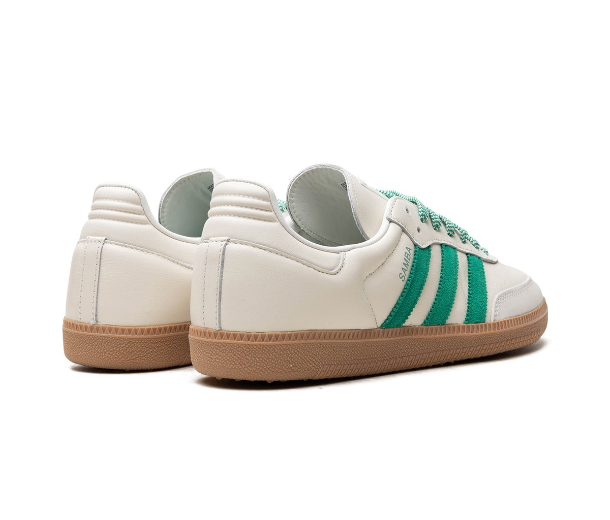 The adidas Samba Off White Court Green (W) women's sneakers feature a creamy white and fresh green upper. Originally designed for the football pitch, the legendary Samba silhouette has become a street fashion icon and a timeless piece in every sneakerhead's shoe collection.