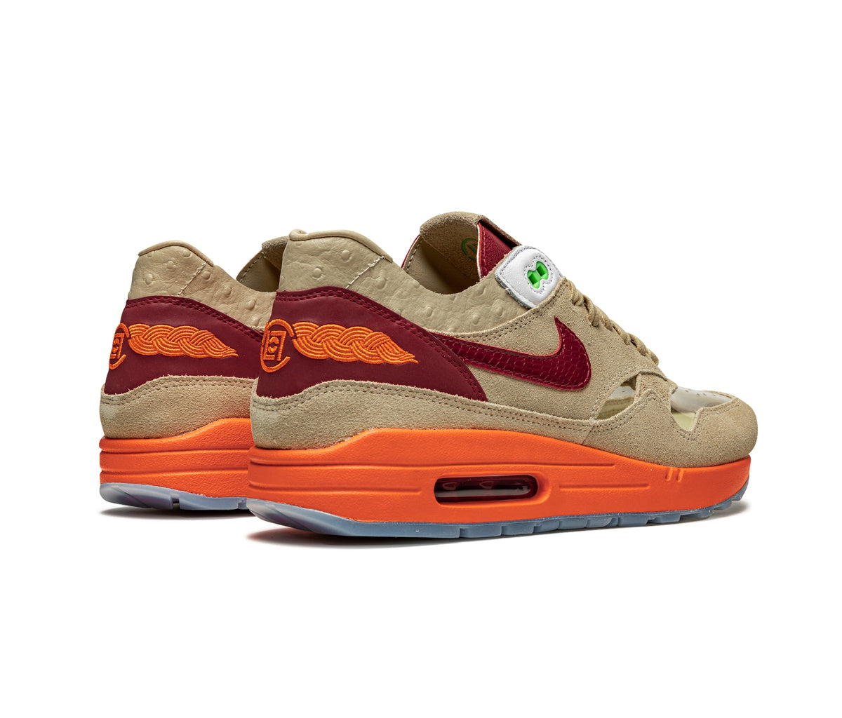Nike Air Max 1 CLOT Kiss of Death (2021) Sneakers Combining transparent elements, suede and leather in brown and orange tones on their uppers, this unique collaboration with CLOT brings the iconic Air Max 1 silhouette to life with a design inspired by traditional Chinese medicine and acupuncture.