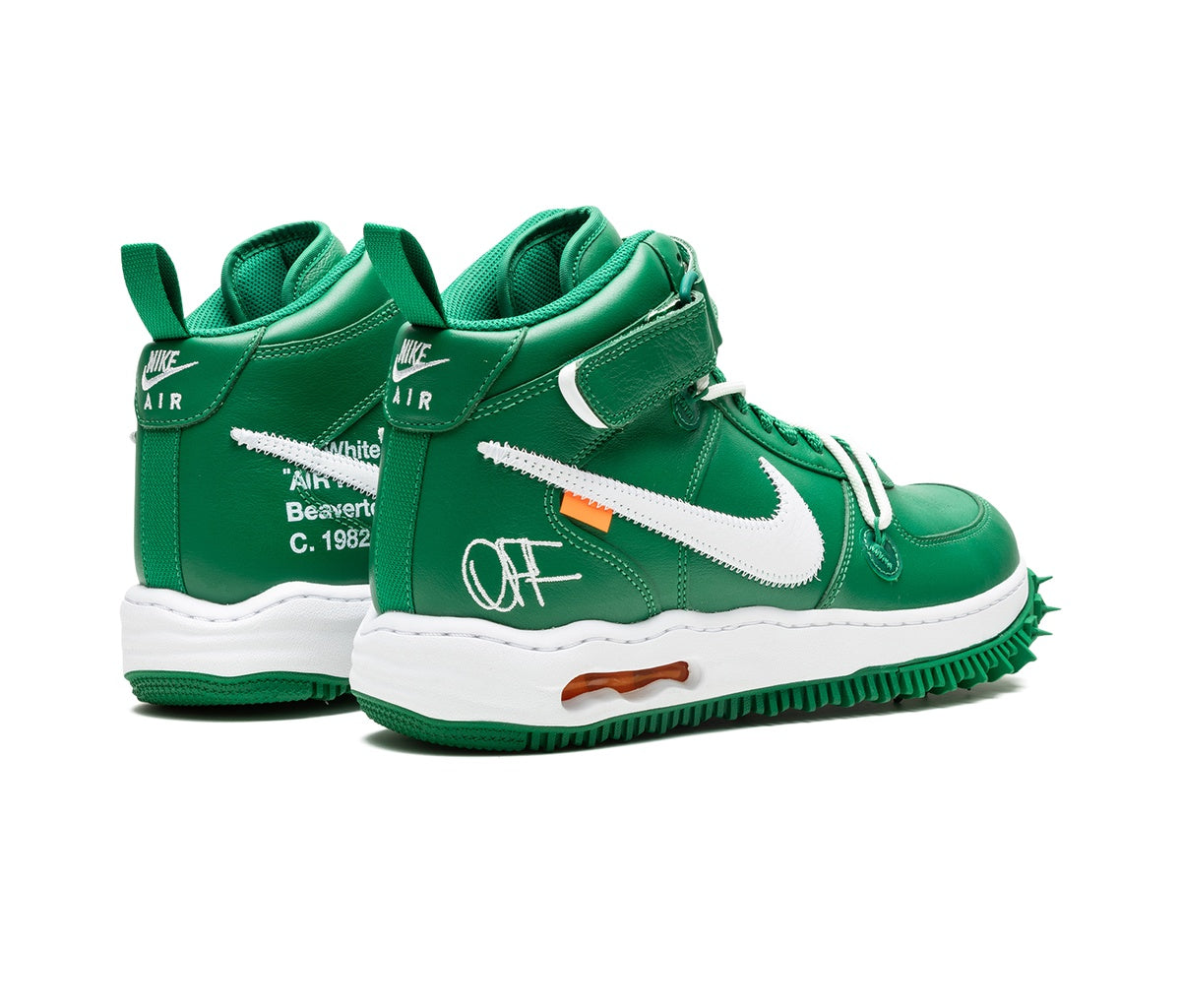 Nike Air Force 1 Mid Off-White Pine Green Ankle Boots Combining fresh green and white with Off-White branding, the Air Force 1 Mid silhouette is designed by the late Virgil Abloh.