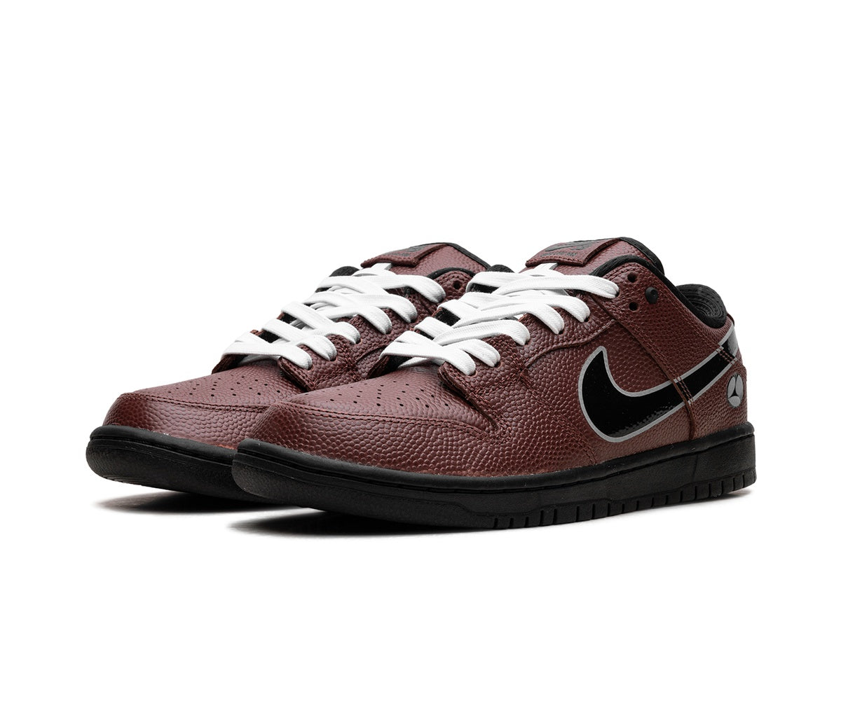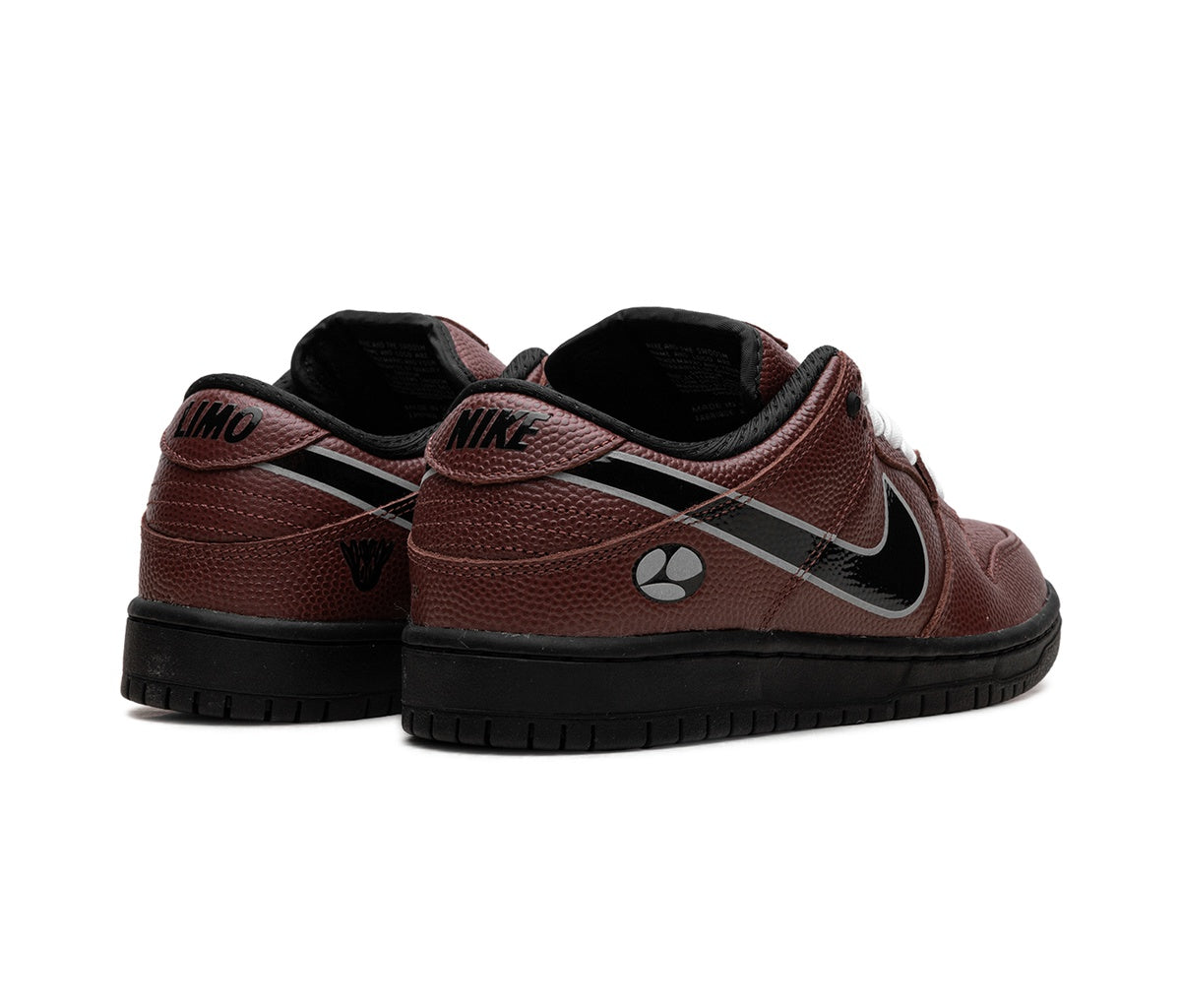 Nízké tenisky Nike SB Dunk Low Limosine Skateboards kombinují na svém svršku hnědé odstíny s černými prvky připomínající míč amerického fotbalu. Klasická silueta Dunk Low SB získala díky této kolaboraci s LIMOSINE SKATEBOARDS nový a nečekaný vzhled.