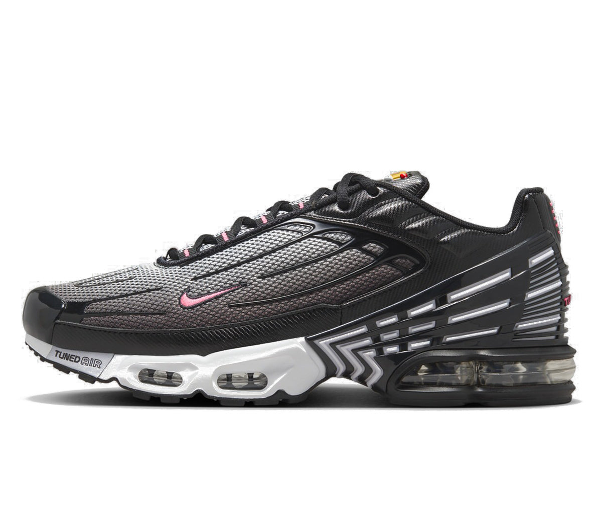 Sneakers Nike Air Max Plus 3 Black White Chamois přinášejí agresivnější evoluci TN siluety v kombinaci černé, bílé a růžové. Výrazné TPU prvky, dynamické linie a robustnější konstrukce dávají modelu tech-futuristic look, který působí ostřeji než klasický Plus. Model navazuje na původní Nike Air Max Plus z roku 1998, ale verze TN3 (Air Max Plus III) posouvá design víc do performance a moderní streetwear estetiky.